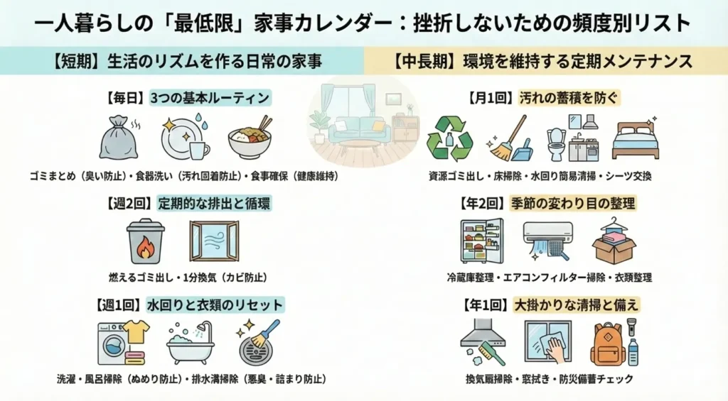そこでここでは、最低限を保つための家事を頻度別に紹介します。これより減らすと衛生的にちょっとヤバい、でもこれさえやっておけば「人が呼べるレベル」は維持できる、というラインです。