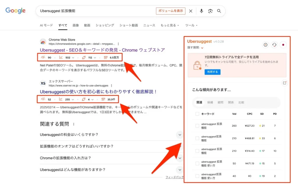 検索ページ上でキーワードの検索ボリュームを直接確認できるChrome拡張機能です。